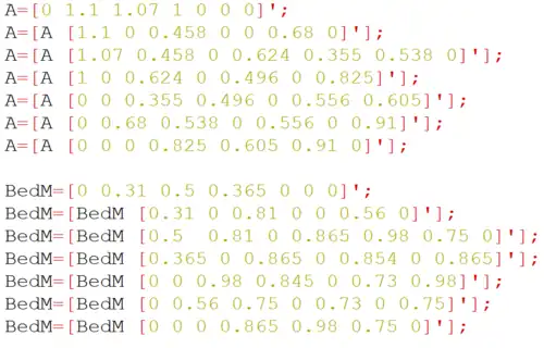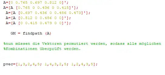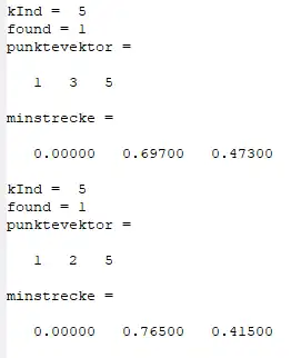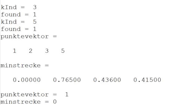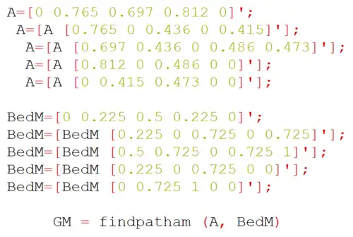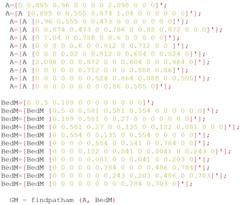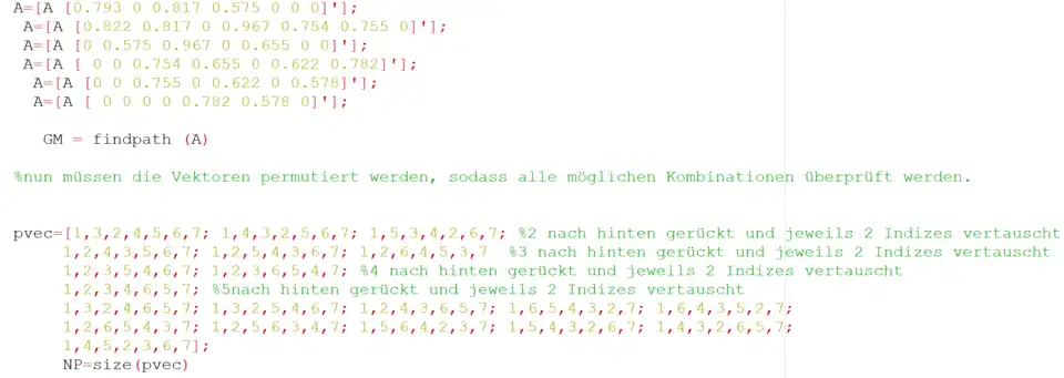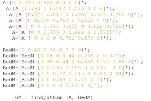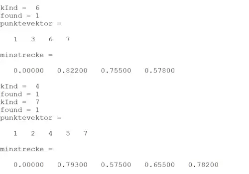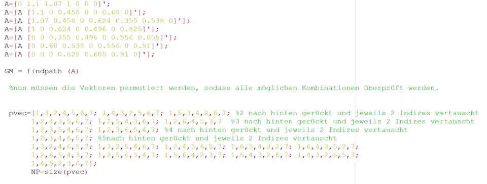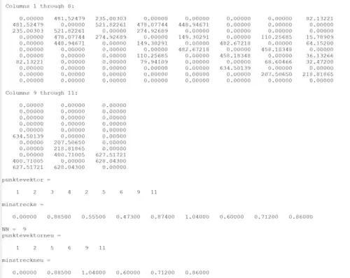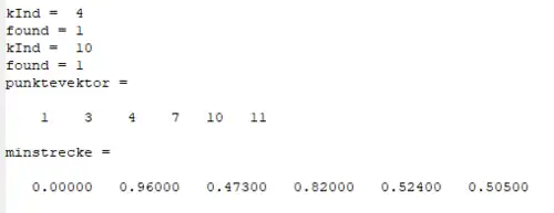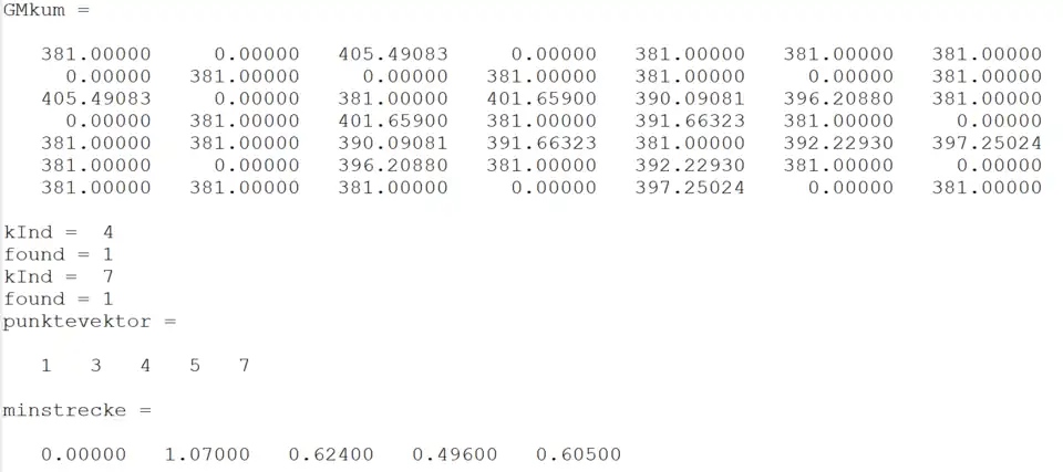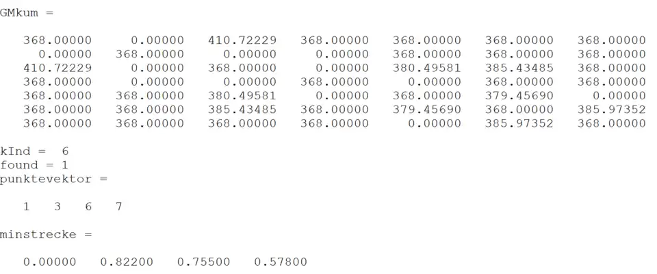 Mit Hilfe einer Funktion, die wir in Octave implementiert haben, können wir den Ameisenalgorithmus bedingt anwenden, wobei diese Funktion nun etwas abgeändert ist, da eine sogenannte Bewertungs- oder Bedingungsmatrix zu der ursprünglichen Matrix addiert wird. So erhält man eine kumulierte "Geruchsmatrix", die den kürzesten Weg mit den am stärksten gewichteten Haltestellen angibt. Dabei muss sich nicht zwingend die Strecke geändert haben, da immernoch die kürzesten Wege betrachtet werden. Im Folgenden kann man dann den Begriff des "besten Weges" anwenden.