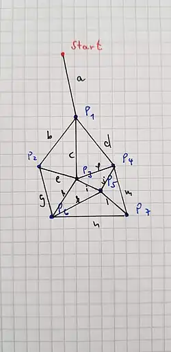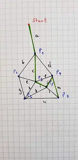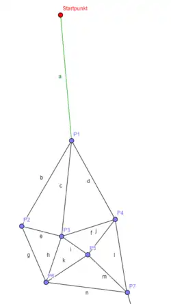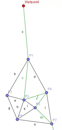 Roter Punkt = Startpunkt / Blauer Punkt = mögliche Haltestellen / schwarze Linien = Verbindungsstrecken