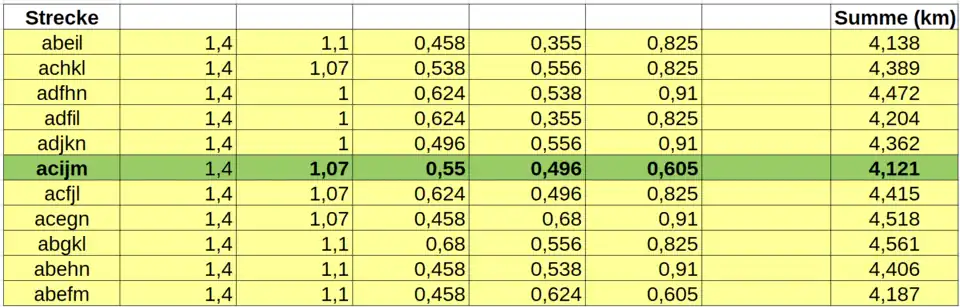 Zu Beginn dieses Zyklus haben wir mit Hilfe von Google Maps potenzielle Haltestellen innerhalb eines Dorfes eingezeichnet, wobei der rote Punkt den Startbahnhof darstellt und der blaue Punkt am Ortsausgang unten rechts das Ende skizziert. Anschließend soll mit Hilfe der Karte eine Skizze erstellt werden. Anhand der beigefügten Tabelle und der Skizze, welche zur Veranschaulichung dient, können dann die Weg- bzw. Streckenlängen abgelesen werden, sodass dadurch der kürzeste Weg bestimmt werden kann. Hierbei sollen die gewählten Wege möglichst nur einmal befahren werden. Die ausgewählten Wege werden anschließend in ein Tabellenkalkulationsprogramm (hier: LibreOffice) übertragen. Dabei muss man durch geschicktes Kombinieren überlegen, welche Strecken mit genau 5 Haltestellen möglich sind. Dies ist bei 11 verschiedenen Möglichkeiten der Fall, was man in der unteren Tabelle erkennen kann. Die Summe über die einzelnen Teilstrecken, um den kürzesten Weg zu ermitteln, wird letztendlich mit Hilfe des Tabellenkalkulationsprogramms mittels Addition der Einzelstrecken berechnet und der günstigste Weg im Streckennetz markiert.