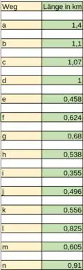 | Weg | Länge in km | Geogebra Streckennetz Waldsee | Matrix (Octave) | Ergebnis (Octave) | Ergebnis (graphisch) |