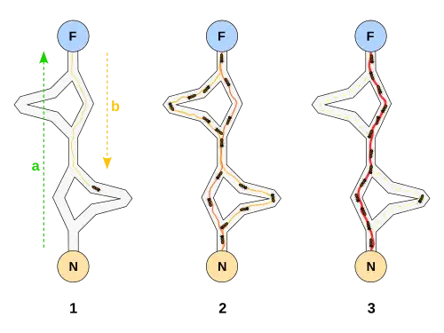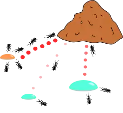 Bei der Futtersuche scheiden einzelne Ameisen entlang ihres Weges einen Duftstoff (Pheromon) aus. Andere Ameisen wählen wahrscheinlicher einen Weg mit höherer Pheromonkonzentration. Verbindet man in einem Experiment eine Futterquelle mit zwei unterschiedlich langen Wegen mit dem Nest, so betreten die Ameisen auf ihrer Suche nach Futter beide Wege etwa gleich häufig. Die Ameisen auf dem kürzeren Weg kehren jedoch schneller von der Futterstelle zurück, so dass mit der Zeit auf dem kürzesten Pfad eine höhere Pheromonkonzentration als auf dem anderen vorherrscht. In der Folge wählen die nachkommenden Ameisen bevorzugt diesen Weg: Sie scheinen entlang einer Straße zu laufen, eine Ameisenstraße ist entstanden.