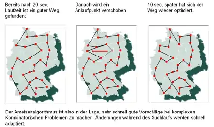 Das Problem des Handlungsreisenden (TSP) kann sehr effizient mit ACO bearbeitet werden. Im Beispiel wird TSP mit 30 „Städten“ bzw. Zielen berechnet (etwa 4,4·1030 mögliche Wege). Die Stärke von ACO, Änderungen im laufenden Suchprozess selbstadaptiv zu verarbeiten, wird im Beispiel deutlich. Bei Verschieben eines Zielpunktes in der nach 20 Sekunden gefundenen Route wird bereits 10 Sekunden später (ohne Reinitialisierung) vom Algorithmus erneut ein guter Wegevorschlag gemacht (siehe Kombinatorik).