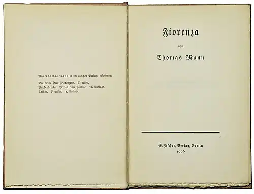 Fiorenza. [Drama.] Berlin: S. Fischer 1906, 170 Seiten + 1 Blatt verso Druckvermerk. Oktav, 18,5 x 13 cm. Kopfgoldschnitt, die übrigen Ränder (Bütten) unbeschnitten. Lesebändchen.
