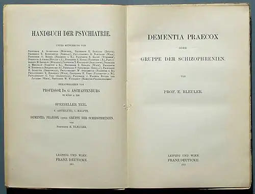 Bleuler, Eugen: Dementia praecox oder Gruppe der Schizophrenien. Leipzig und Wien: F. Deuticke 1911, Erstausgabe.