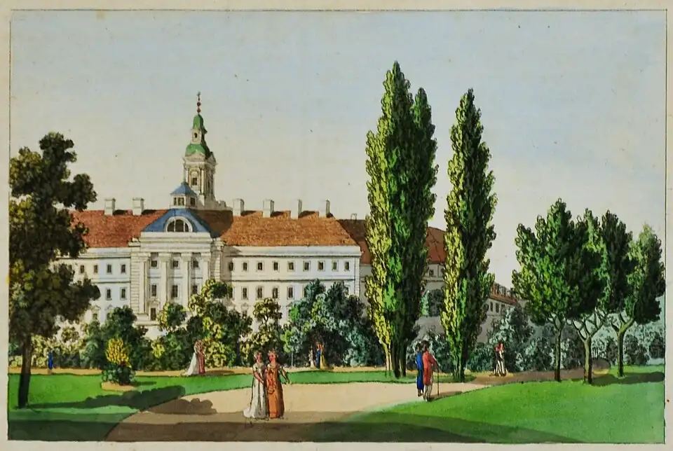 «Das Georgen Hospital». Aquarellierte Radierung 15,5 x 21 cm (Plattenrand). Aus: Schwarz, Karl Benjamin: Romantische Gemählde von Leipzig. Eine Folge von vier und zwanzig Prospecten gezeichnet und gestochen von Karl Benjamin Schwarz. Leipzig: Karl Tauchnitz 1804, Tafel Nr.3.