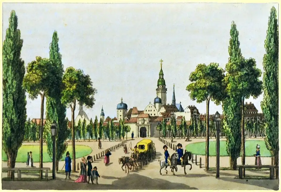 [Leipzig] Das Grimmische Thor [sic]. Aquarellierte Radierung 15,5 x 21 cm (Plattenrand). Aus: Schwarz, Karl Benjamin: Romantische Gemählde von Leipzig. Eine Folge von vier und zwanzig Prospecten gezeichnet und gestochen von Karl Benjamin Schwarz. Leipzig: Karl Tauchnitz 1804: Tafel Nr.1.