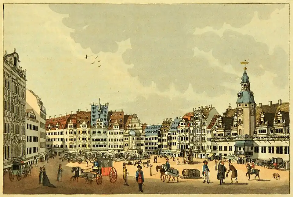 Leipzig: Der Markt aus der Petersstrasse (Tafelblatt Nr. 22). Aquarellierte Radierung 15,5 x 21 cm (Plattenrand) aus: Schwarz, Karl Benjamin: Romantische Gemählde von Leipzig. Eine Folge von vier und zwanzig Prospecten gezeichnet und gestochen von Karl Benjamin Schwarz. Leipzig: Karl Tauchnitz 1804, 56 S. + 23 aquarellierte Kupfertafeln + 1 nicht kolorierte Radierung.