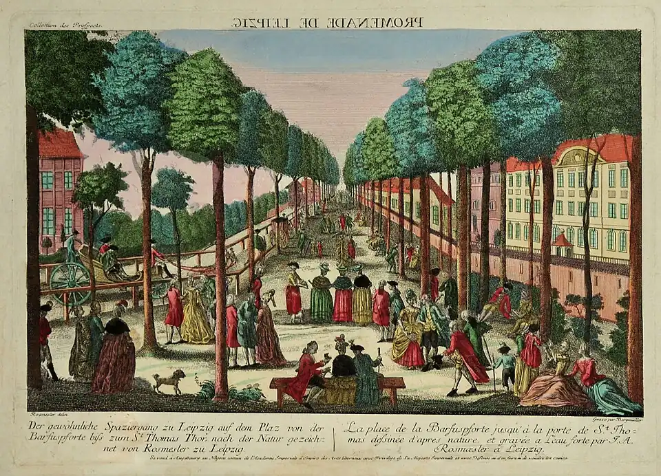 Bergmüller, Johann Baptist: "Der gewöhnliche Spaziergang auf dem Plaz vor der Barfuspforte bis zum St. Thomas Thor, nach der Natur gezeichnet von Rosmesler zu Leipzig." Kupferstich 29,3 x 41,3 cm Plattenrand, zeitgenössisch koloriert. Guckkastenblatt. Gestochen von Johann Baptist Bergmüller (1724 - 1785, THIEME-BECKER Bd. XXX, S.411) nach einer Zeichnung von Johann August Rosmäßler (1752 - 1783, THIEME-BECKER Bd. XXX, S. 77). Das Guckkastenblatt zeigt eine beliebte Flaniermeile in Leipzig, etwa zu der Zeit, als der junge Goethe hier gelebt hat.