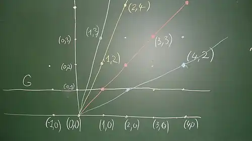 betrachtet. Ein Paar ist dann ein Gitterpunkt, wobei wir uns die ganzen Zahlen als die Punkte(wo also die zweite Komponente konstant ist.) bezeichnen wir mit . Ein jeder Punkt definiert eine eindeutige Gerade, die durch diesen Punkt und durch den Nullpunkt verläuft. In dieser geometrischen Interpretation sind zwei Punkte und genau dann äquivalent, wenn sie die gleiche Gerade definieren, und dies ist genau dann der Fall, wenn ihre „Steigungen“ übereinstimmen. Zwei Punkte liegen ja auf der gleichen Geraden genau dann, wenn sie, wenn man durch Streckung ihre zweite Koordinate zur Übereinstimmung bringt, dann auch die erste Koordinate übereinstimmt. Wenn man den ersten Punkt mit streckt (multipliziert) und den zweiten Punkt mit , so erhält man die beiden Punkte und , und die Gleichheit vorne war die Definition für die Relation.