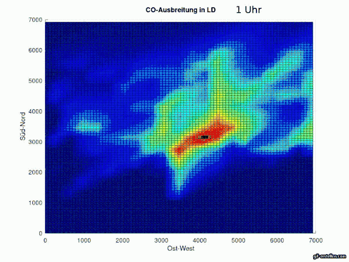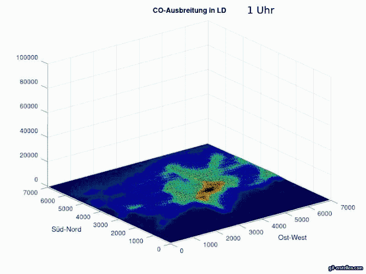 Die Modellierung stellt dar, wie viel Kohlenstoffmonoxid von Autos in der Stadt Landau (Pfalz) ausgestoßen wird und wie sich dieser Stoff mit der Zeit (im Stundentakt und bei Windstille) verteilt.