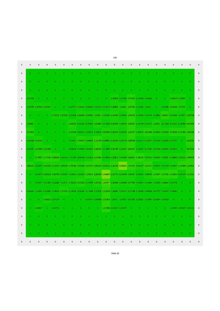Die Modellierung zeigt im Stundentakt, wie sich das CO innerhalb der Stadt verbreitet. Für jeden Zeitpunkt wurde eine Tabelle angelegt, in der eine Matrix das CO-Aufkommen zu diesem Zeitpunkt beschreibt. Die zusätzlichen Zeilen und Spalten werden gebraucht, um einen Rand mit Nullen zu definieren. Diese Randbedingung sorgt dafür, dass das CO sich frei in die Umgebung verteilt und dass von außerhalb der Stadt kein CO rein kommt.