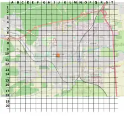 Um die Diffusion von Kohlenstoffmonoxid in Landau in einer Tabellenkalkulation implementieren zu können, wurde zunächst ein 20x20 Raster auf die Stadtkarte gezeichnet, das die Stadt in 400 Felder einteilt (siehe Abbildung). Durch die Beschriftung der Spalten mit Großbuchstaben und der Zeilen mit Zahlen, hat jedes Feld eine eigene Benennung (z.B. befindet sich der Hauptbahnhof in der Zelle N11).