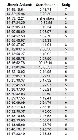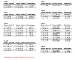 Am Landauer Busbahnhof wurden die Standzeiten der Busse gestoppt. Alle bis auf einen Busfahrer hatten in ihrer Standzeit den Motor an gelassen. Die Abbildungen stellen tabellarische Übersichten der gemessenen Daten mit unterschiedlicher Sortierung dar.