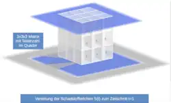Für die Speicherung der Verteilung der Schadstoffe in Zeitschritten werden verschiedene dreidimensionale Schadstoffmatrix benötigt. Die einzelnen Matrizen zum Zeitpunkt haben nicht-negative Einträge in den Komponenten mit , und . So entsteht ein Quader, der in Länge, Breite und Höhe in insgesamt Teilquader zerlegt ist. Insgesamt erhält man eine 4-dimensionale Datenstruktur, die 3 Raumkoordinaten und eine Zeitkoordinate mit enthält.