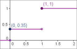 Die Abbildung zeigt eine Verteilungsfunktion einer Bernoulli-Verteilung zum Parameter mit charakteristischen Sprungstellen bei 0 und bei 1.