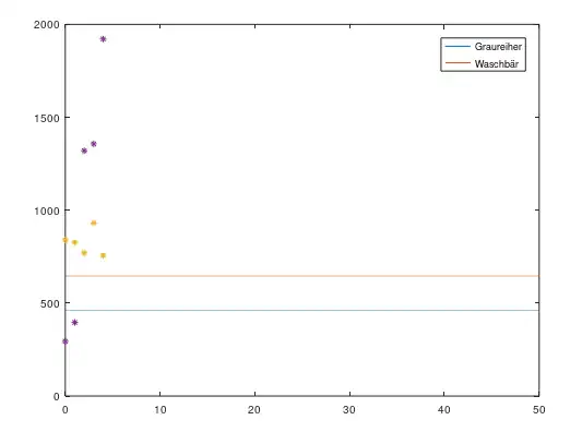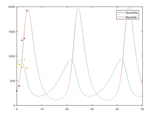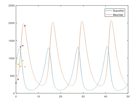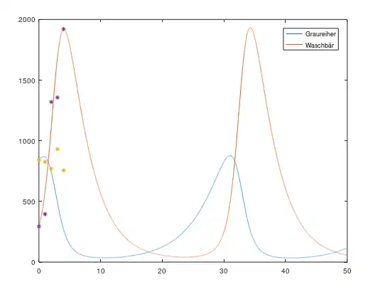Wir sehen, dass sich der Graph der Räuberpopulation relativ an unsere tatsächlichen Werte annähern lässt. Der Graph der Beutepopulation weicht jedoch stark von den gegebenen Werten ab. Dies kann verschiedene Gründe haben. Zum einen sind die eingetragenen Werte nur Hochrechnungen von den Totfunden der Waschbären bzw. den Brutpaaren und den durchschnittlichen Geburten der Graureiher. Zum anderen unterliegen die genutzten Rohdaten nicht nur der Wechselwirkung dieser beiden Populationen, sondern auch anderen Einflussfaktoren wie zum Beispiel andere Räuber, Nahrungsangebot, Klimaschwankungen, Habitat.