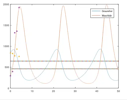 Die Populationen befinden sich im Gleichgewicht wenn es ungefähr 462 Graureiher und 645 Waschbären gibt. Nimmt man diese Mittelwerte als Anfangszustand an, so würden die Populationen konstant bleiben.