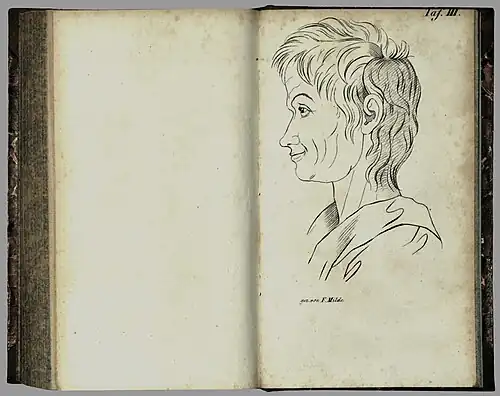 "Der Wuchs dieser Frau ist sehr lang, ihre Haare sind weiß, die Stirne groß; ihre großen Augen sind blau, oft stier, die Pupillen erweitert. Ihre schwarzbraune Gesichtsfarbe, die Magerkeit, die Runzeln der Haut, das Fehlen der Zähne, Alles zeigt in dieser Figur die die Züge der Hinfälligkeit, neben Spuren ehemaliger Schönheit.