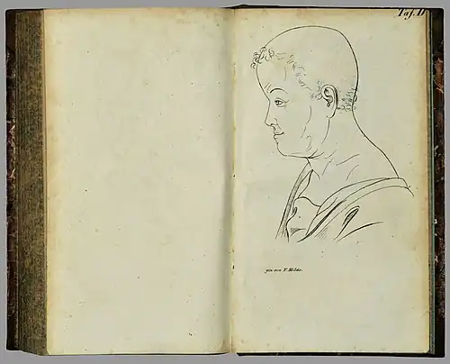 "Dieser Kopf zeichnet sich vorzüglich durch seinen Umfang und durch die hervorragende Stirn aus, wodurch der Winkel der Gesichtslinie an 90 Grad hat, aber durch die Disharmonie mit den übrigen Theilen von Schönheit weit entfernt ist. [Hydrozephal konfigurierter Schädel]
