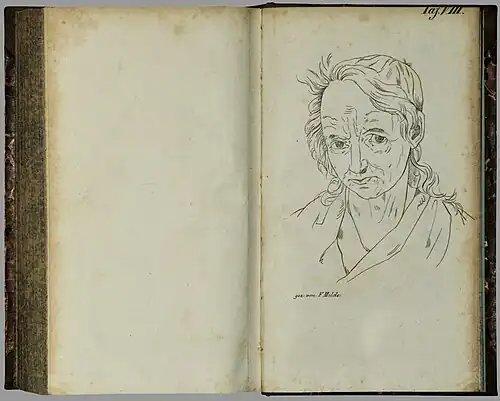 Diese Frau ist sehr mager, ihre Haut sehr schwarz; Kummer und Verzweiflung stehen auf ihrem Gesichte, das sehr runzlig ist, geschrieben; sie geht still und strickend herum, weicht ihren Begleiterinnen aus, und seufzt über ihren erbärmlichen Zustand, den nichts zu verändern vermag. Sie ist ruhig, verträgt Widerspruch, und hat ein großes Verlangen, wiederhergestellt zu werden. Dieser Hoffnung schmeichelnd ist sie mit ihrer Einwilligung viermal magnetisiert worden, ohne daß sich der geringste Erfolg gezeigt hätte. In der Hoffnung, daß ihr Bild, welches wir mitgetheilt haben, zu dem Erzbischof getragen werde, saß sie gern, um sich zeichnen zu lassen. Dies ist der Zustand der Unglücklichen seit zwölf Jahren. (S. 265 – 67)
