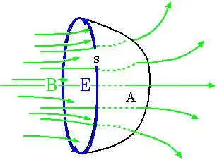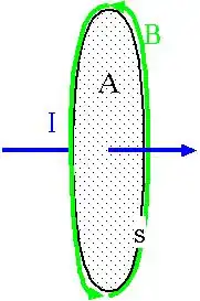 Gegeben ist eine offene Fläche im Raum. Das ist eine Fläche mit einem Rand. Wir können uns einfach eine Kreisscheibe oder ein Quadrat vorstellen. Die Fläche kann aber auch nicht-eben sein, beispielsweise ein Duschvorhang oder eine Plastiktüte ohne Grifflöcher. Integrieren wir nun das Magnetfeld entlang des Rands, erhalten wir einen Wert, der proportional zum Strom ist, der die Fläche durchdringt. Und zwar unabhängig davon, ob die Fläche eben ist oder irgend wie "gebauscht". So lange wir den Rand nicht ändern, können wir die Fläche beliebig verformen, das Integral wird immer den gleichen Wert liefern. Das Bild links zeigt den einfachen Fall einer von einem Strom "durchstoßenen" Kreisscheibe.