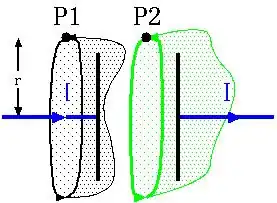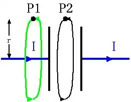 Nehmen wir als Flächen einfache Kreisscheiben an. Dann liefert das Ringintegral des Magnetfelds längs der grün gezeichneten Linie einen Wert, der proportional ist, denn der Strom "durchbricht" die Kreisscheibe. Am Punkt P1 lässt sich also ein Magnetfeld feststellen. Andererseits fließt durch die Kreisscheibe bei P2 kein Strom. Das Ringintegral längs der schwarzen Linie muss dann Null ergeben. Das erzwingt die rechte Seite des ampère'schen Gesetzes. Die linke Seite kann aber nur Null sein, wenn das Magnetfeld längs der Linie Null ist. Folge: Am Punkt P2 gibt es kein Magnetfeld. Das ist merkwürdig, weil das bedeuten würde, dass das Magnetfeld schlagartig verschwindet, wenn wir die Kreisscheibe, über die ich integriere, von P1 nach P2 bewegen.