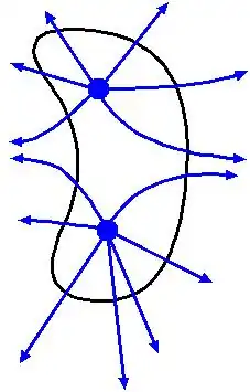 Dabei ist nun eine geschlossene Fläche (das ist eine Fläche ohne "Rand", die einen Raum vollständig umschließt, in einem einfachen Fall eine Kugelfläche). Diese Formel kann umgeformt werden, so dass die Ladungsdichte statt der Ladung auftritt, näheres dazu siehe im Wikipedia-Artikel. Die Abbildung rechts zeigt einen zweidimensionalen Schnitt durch eine dreidimensionale Oberfläche.