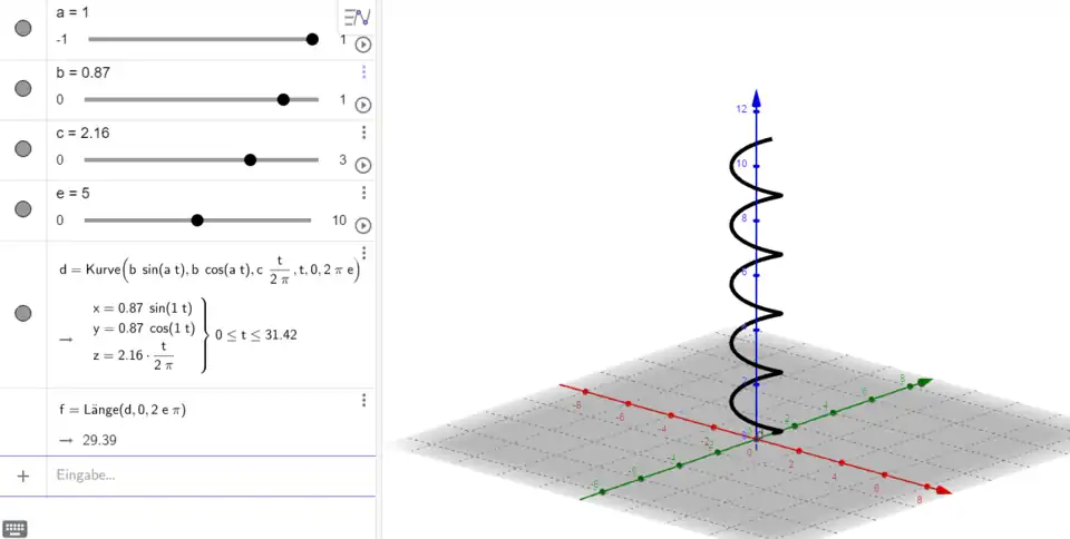 Mit Hilfe von Geogebra betrachten wir den Weg über die Feuertreppe als 3-dimensionale Kurve. Durch die Verwendung des Befehls "LÄNGE" lässt sich die Bogenlänge L des Weges bestimmen. Alternativ ist auch eine Bestimmung über folgendes Integral möglich: