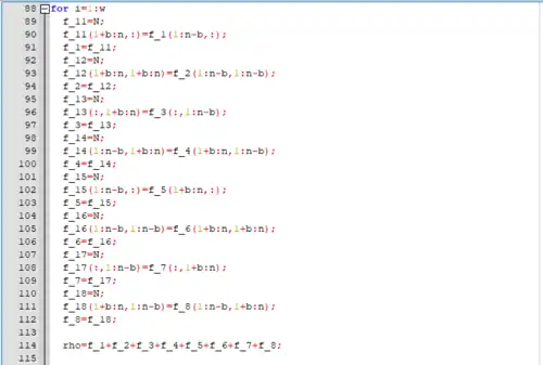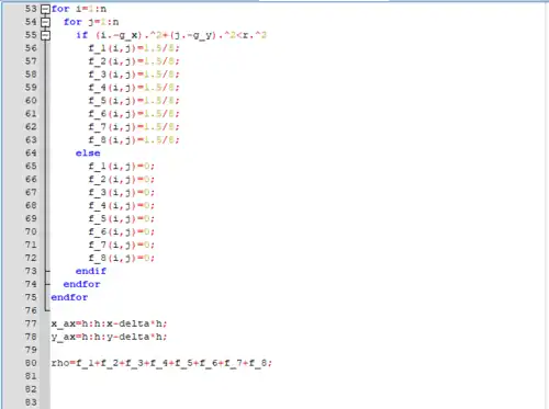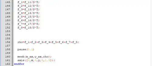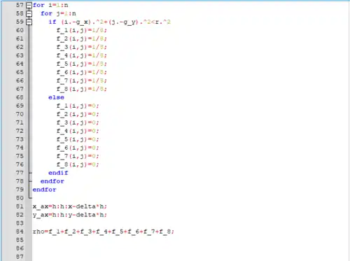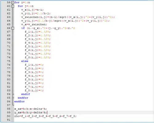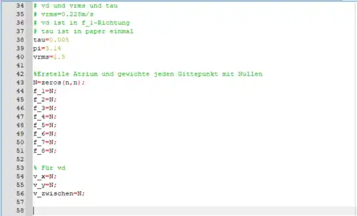 Zuerst wird diese für die numerische Berechnung sowohl in Zeit, Geschwindigkeit und Raum diskretisiert. Im vorliegenden Zyklus wird der Orts-Raum durch eine quadratische Matrix mit endlich vielen Einträgen angenähert. Auch die kontinuierliche Geschwindigkeitsverteilung im Geschwindigkeits-Raum wird durch 8 Bewegungsrichtungen (k=1,2,...,8) angenähert. Die anschließenden Rechenschritte werden für endlich große Zeitintervalle ausgeführt.