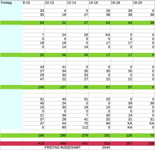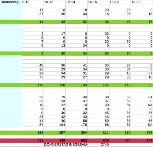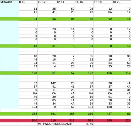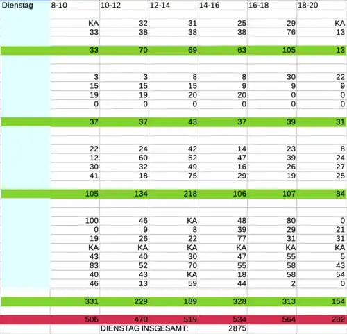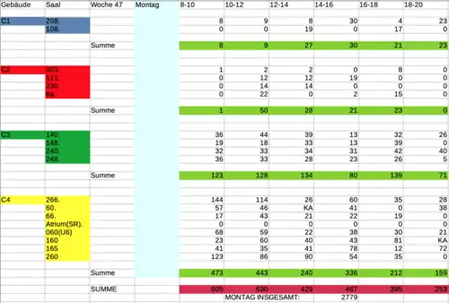 Für die Rohdaten wurden die Teilnehmerzahlen der Veranstaltungen in den Gebäuden C1 bis C4 von Montag bis Freitag (18.11 - 22.11.19), zwischen 08:00 Uhr und 20:00 Uhr, anhand der Belegungsinformationen, in KLIPS verwendet.