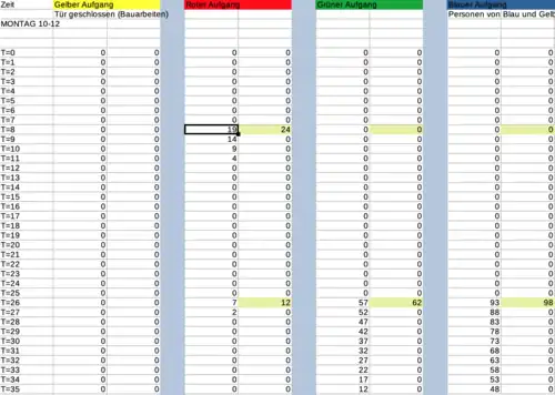 Der Befehl beschreibt die oben im Screenshot ausgewählte Zelle E14. In den Rechten Spalten werden die neu ankommenden Personen gelistet und zur linken Spalte hinzu addiert. Dadurch, dass der gelbe Ausgang wegen einer Baustelle gesperrt ist, verlassen in diesem Modell alle Personen aus dem gelben Trakt das Atrium über die blaue Tür. Dies hat zur Folge, dass es länger dauert bis sie an der Tür ankommen.