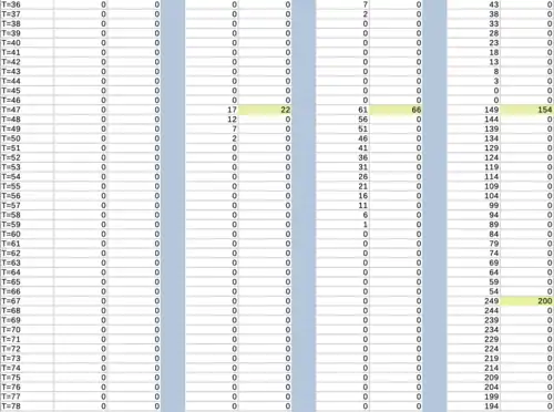 In der linken Spalte der Tabelle stehen die Anzahl der Personen zum Zeitpunkt t. In der rechten Spalte die Personen die von den jeweiligen Stockwerken dazu stoßen.