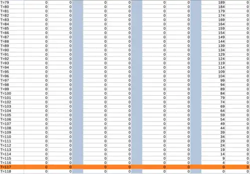 Die Tabellenkalkulation ergibt, dass es 117s dauert bis sich niemand mehr im Atrium befindet.