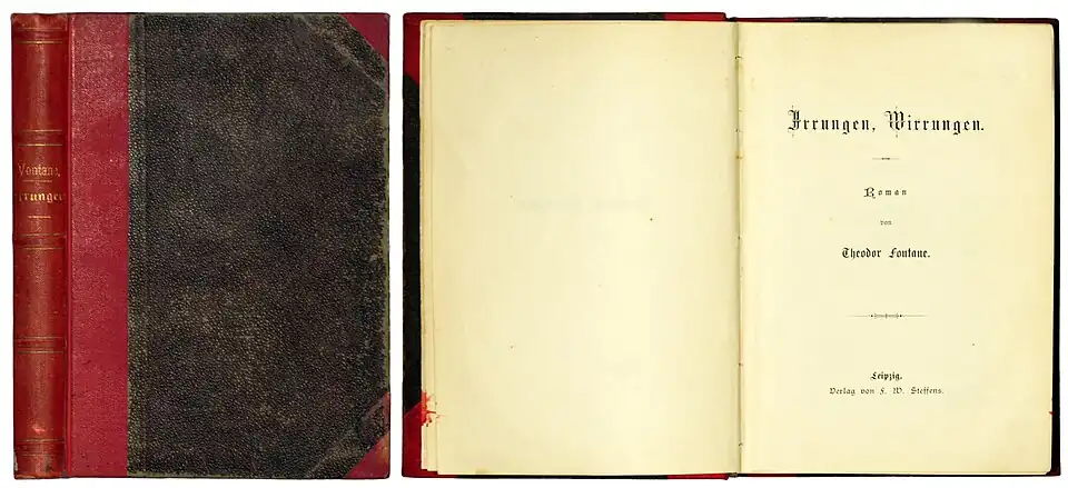 Fontane, Theodor: Irrungen, Wirrungen. Roman. Halbleinen der Zeit Oktav, Rückentitel „Vontane“ statt Fontane. Bibliographie und Editionsgeschichte: → [x]