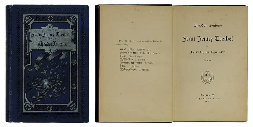 Fontane, Theodor: Frau Jenny Treibel oder „Wo sich Herz zum Herzen find`t“. Berlin: F. Fontane & Co. 1893, 336 S., Verlagseinband und Titel des Erstdrucks.