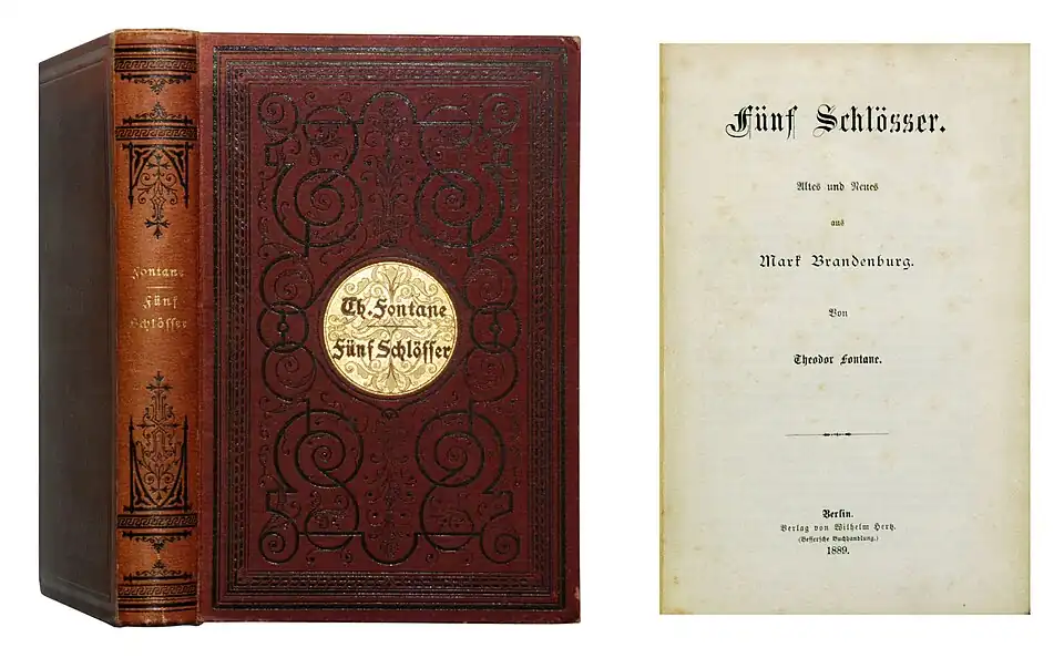 Fontane, Theodor: Fünf Schlösser. Altes und Neues aus Mark Brandenburg. Berlin: W. Hertz 1889, 468 S., Erstausgabe.Original-Leinen, Oktav.weiter Übersicht zurück