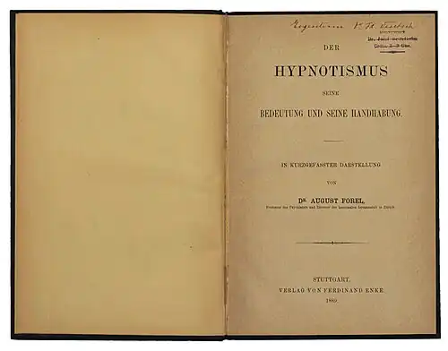 August Forel (1848 – 1931): Schweizer Psychiater. Seit 1879 Direktor der Psychiatrischen Klinik Burghölzli bei Zürich. Hielt als erster Vorlesungen in der Schweiz über Hypnose. Gründete zusammen mit Grossmann die „Zeitschrift für Hypnotismus“. Die abgebildete Monographie zählt zu seinen bekanntesten Werken (12. Aufl. 1923).