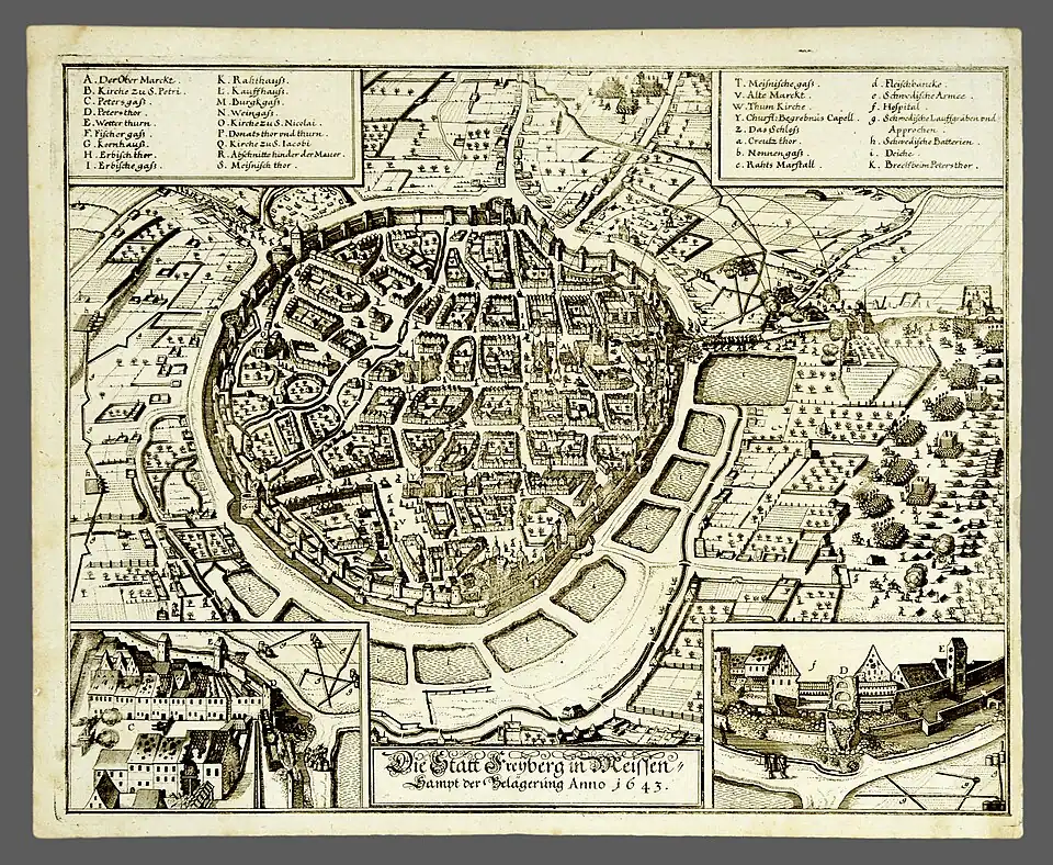 Freiberg in Meissen [Meissen steht hier für Sachsen]. Kupferstich ohne Nennung von Zeichner und Stecher. Dargestellt ist Freiberg aus der Vogelperspektive während der Belagerung 1643.