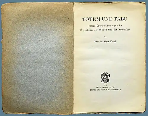 Freud, Sigmund: Totem und Tabu. Einige Übereinstimmungen im Seelenleben der Wilden und der Neurotiker. Leipzig und Wien: H. Heller & Cie. 1913, Originalbroschur des Erstdrucks.