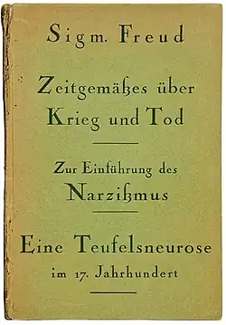 Freud, Sigmund: Zeitgemäßes über Krieg und Tod. Zur Einführung des Narzissmus. Eine Teufelsneurose im 17. Jahrhundert. Leipzig Wien Zürich: Internationaler Psychoanalytischer Verlag 1924, Erstdruck.