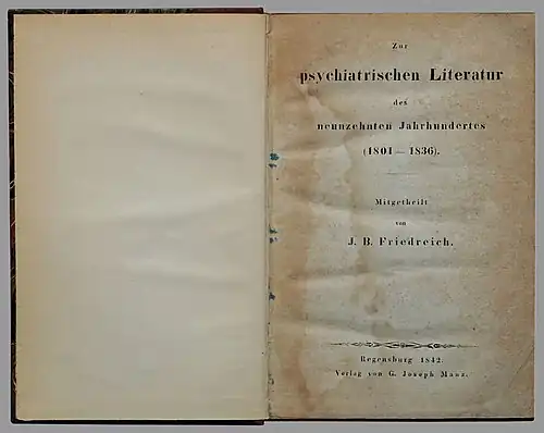 Friedreich, Johann Baptist: Zur psychiatrischen Literatur des neunzehnten Jahrhunderts (1801 – 1836). Regensburg: G. J. Mauz 1842.