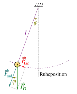 und es handelt sich um eine geführte Bewegung im Sinne von Fakt. Hier ist es einfacher, die Bewegungsgleichung nicht als anzusetzen, sondern als eine Bedingung für den (Ausschlags-) Winkel der Bewegung, also als , wobei der Winkel zwischen dem vertikalen Lot und dem Auslenkungsfaden gemessen wird. Es besteht der Zusammenhang