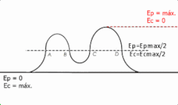 Die Formel aus Fakt, die die geführte Bewegung auf einem Funktionsgraphen im Gravitationsfeld beschreibt, kann man auch aus dem Energieerhaltungssatz ableiten. Die Energie des bewegten Teilchens setzt sich aus der Lageenergie und der Bewegungsenergie zusammen. Die Lageenergie ist dabei gleich , wobei die Masse des Teilchens ist (die Lageenergie wird also gleich bei der Höhe gesetzt) und die Bewegungsenergie ist , wobei die Gesamtbewegung auf dem Graphen beschreibt. Somit ist die Gesamtenergie gleich das -fache von