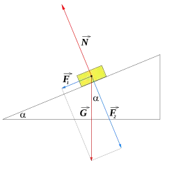 Es sei eine differenzierbare Funktion, wir stellen uns ihren Graphen als ein Profil vor, auf dem sich ein Massekörper (ein Teilchen) unter der konstanten Schwerkraft bewegt (ohne Reibungsverlust), man spricht von einer geführten Bewegung. Die Schwerkraft wirkt nach unten, für die Beschleunigung in Richtung der -Achse ist aber nur die zum Graphen tangentiale Komponente des Kraftvektors verantwortlich. Der Kraftvektor ist also für jeden Punkt zu zerlegen in einen zur Tangente parallelen Anteil und einen dazu senkrechten Anteil (letzterer beschreibt die Kraft, die entgegengesetzt aufgewendet werden muss, damit die Bewegung in der vorgegebenen Bahn bleibt, sie ist für das Folgende unerheblich). Dieses Kräftedreieck ist ähnlich zum Steigungsdreieck der Funktion in . Im Steigungsdreieck ist die Länge der horizontalen Komponente gleich , die Länge der vertikalen Komponente gleich und die Hypotenuse hat die Länge (mit dem Steigungswinkel ist ). Im Kräftedreieck ist die Länge der Hypotenuse gleich , und wegen der Ähnlichkeit (Stichwort Strahlensatz) ergibt sich für die Stärke der tangentialen Kraft die Beziehung
