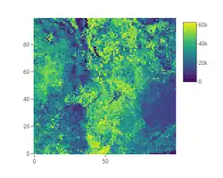Die Modellierung basiert auf einem Datensatz, der der Webseite des Malaria Atlas Projekts entnommen wurde. Die heruntergeladene Rasterdatei gibt für Quadrate mit einer Seitenlänge von ca. 5 km eine modellierte, gemittelte relative Wahrscheinlichkeit für das Vorkommen von Mücken des Anopheles gambiae Spezies Komplex an.[7] Die Rasterdatei wurde in Octave in eine Matrix umgewandelt, wobei die relativen Wahrscheinlichkeiten für das Vorkommen willkürlich in absolute Werte umgewandelt wurden. Die von uns verwendeten absoluten Zahlen sind nur in Relation zueinander aussagekräftig und erlauben keinen Rückschluss auf die tatsächliche Zahl der Mücken in der Region.