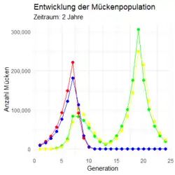 Zur Vereinfachung wurde eine Generationslänge von einem Monat angenommen, an dessen Ende ein vollständiger Generationswechsel stattfindet. Zu diesem Zeitpunkt wird die neue Generation geboren, während die alte Generation vollständig stirbt. Um die Anzahl an Nachkommen pro Mücke einzuschätzen, wurden Daten aus einer Kohortensterbetabell genutzt, die auf Grundlage einer Laborstudie für die Art Anopheles gambiae bestimmt wurde.[6] Es ergab sich, dass pro weiblicher Mücke etwa 11,374 weibliche Nachkommen nach 14 Tagen die Geschlechtsreife erreichen.