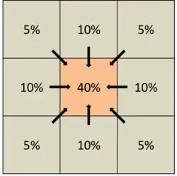 Zwischen den Generationswechseln findet jeweils eine Umverteilung der vorhandenen Mücken statt. Hierbei gehen wir davon aus, dass sich die Tiere unabhängig voneinander in beliebige Richtung bewegen, sodass die Gesamtzahl an Mücken pro Quadrat gleich bleibt. Wir setzen willkürlich fest, dass in jeder Generation jeweils 10% der Mücken in direkt benachbarte Felder und jeweils 5% der Mücken in diagonal angrenzende Felder gelangen. Wir nehmen den betrachteten Ausschnitt als abgeschlossenen Bereich an, es findet kein Austausch mit Tieren außerhalb dieses Bereichs statt.