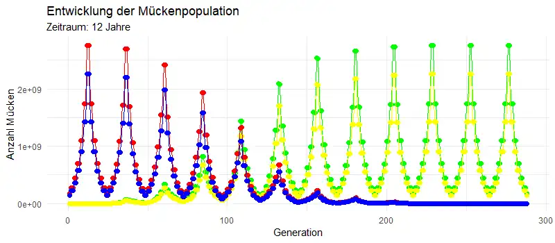 Unser Modell vereinfacht den Lebenszyklus der Mücken stark. Realistischer wäre es, anzunehmen, dass es bei den Mücken ab erreichen der Geschlechtsreife zu jedem Zeitpunkt mit einer gewissen Wahrscheinlichkeit zur Fortpflanzung kommen kann. Das würde auch bedeuten, dass zu jedem Zeitpunkt neue Mücken geboren werden bzw. sterben. Modelliert man die Populationsentwicklung auf diese Weise, würde eine höhere zeitliche Auflösung erreicht werden mit dieser man die Ausbreitung des Gens betrachten kann. Allerdings würde damit auch eine höhere Komplexität des Programms und mehr benötigte Rechenleistung einhergehen.