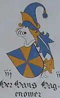 | - 16 - | Meyer-Niessen | Meigerniesse | Johans | Stammes- und Wappenverwandte der Herren Geben; Möglicherweise handelt es sich bei "Johans" um den Hachbergischen Bannterträger bei der Schlacht bei Sempach. Dieser wird jedoch i.d. Regel nich als Johans sondern als Henman bezeichnet. Johann Meigernies 1359, Pfleger der Kinder des † Götz Liebermann 1363; als Bruder seiner Gattin wird 1364 Hermann Goldsmid (Lermündeli) bezeichnet.[20] | Heinrich Schreiber: Urkundenbuch der Stadt Freiburg im Breisgau | |
