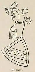 | - 11 - | Meinwart | Meinwart | Cuonrat | Adelsgeschlecht[21]; Das Wappen zeigt auffallende Ähnlichkeit mit dem der Herren Geben | Heinrich Schreiber: Urkundenbuch der Stadt Freiburg im Breisgau | ![]() |